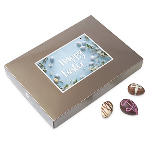 15 gevulde chocolade paaseitjes, gemaakt van pure, witte en melkchocolade en schitterend versierd.