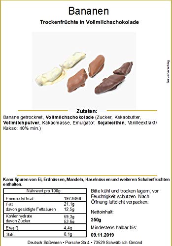 Gedroogde bananenstukken gechocoleerd, natuurgedroogde bananen hebben door de zachte droging een intens aroma. In combinatie met de Duitse chocolade die we gebruiken is het genot onvergetelijk. Wij gebruiken uitsluitend kwaliteitschocolade “Made in Germany”. Dit wordt gekenmerkt door een extra hoog cacaogehalte.