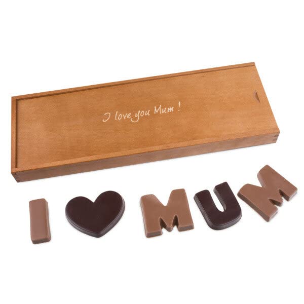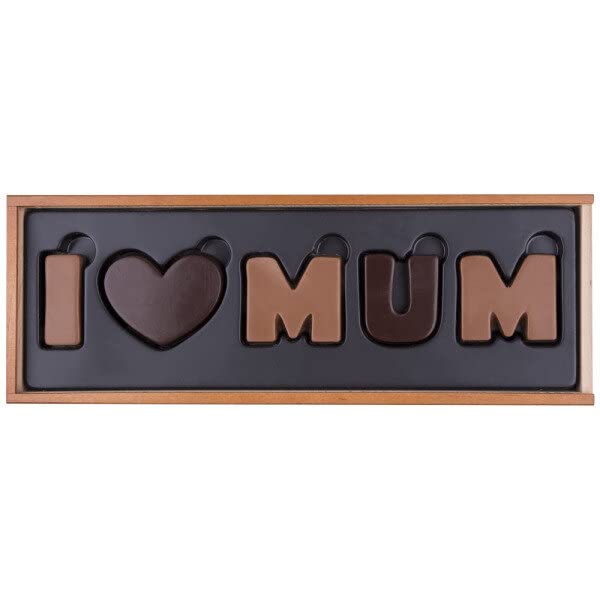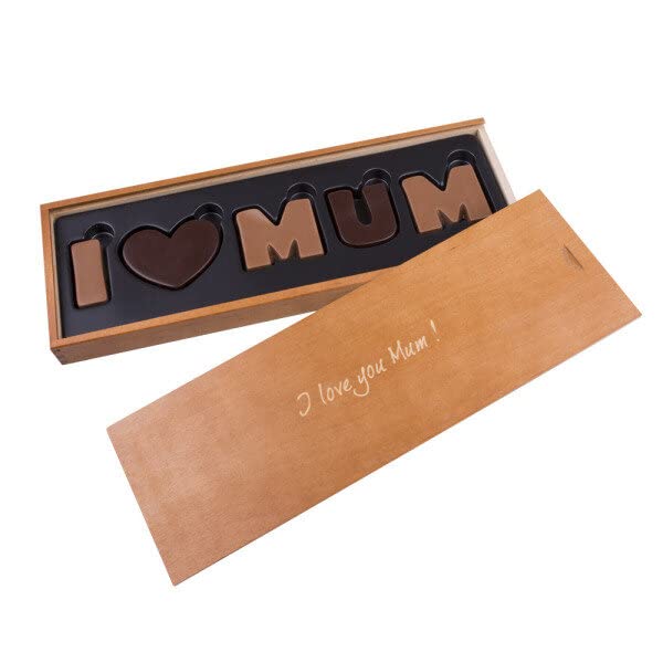 Dit moederdagcadeau inspireert met uiterlijk en smaak. De liefdesboodschap aan de moeder bestaat uit zacht smeltende melk- en zachtbitterchocolade en is verpakt in een elegante houten doos, die is voorzien van het opschrift ‘I love you Mum’. Omdat bij de productie van het product geen conserveringsmiddelen worden gebruikt, bedraagt de houdbaarheid maximaal 6 maanden.