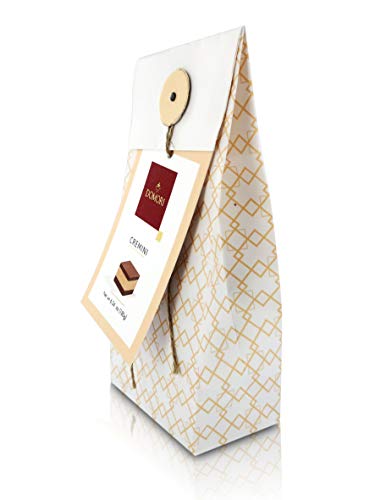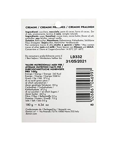 Elegante papieren zak met eenvoudig en geraffineerd design, bevat 180 g Domori crèmes in klassieke uitvoering. De traditionele bonbons van Piemonte in kubusvorm en karakteristieke gelaagd bestaan uit twee lagen Janduia, die een fluweelachtige hazelnootcrème bevatten. Een vleugje waardevolle zoutbloem benadrukt de geur van hazelnoot optimaal tot zijn recht.